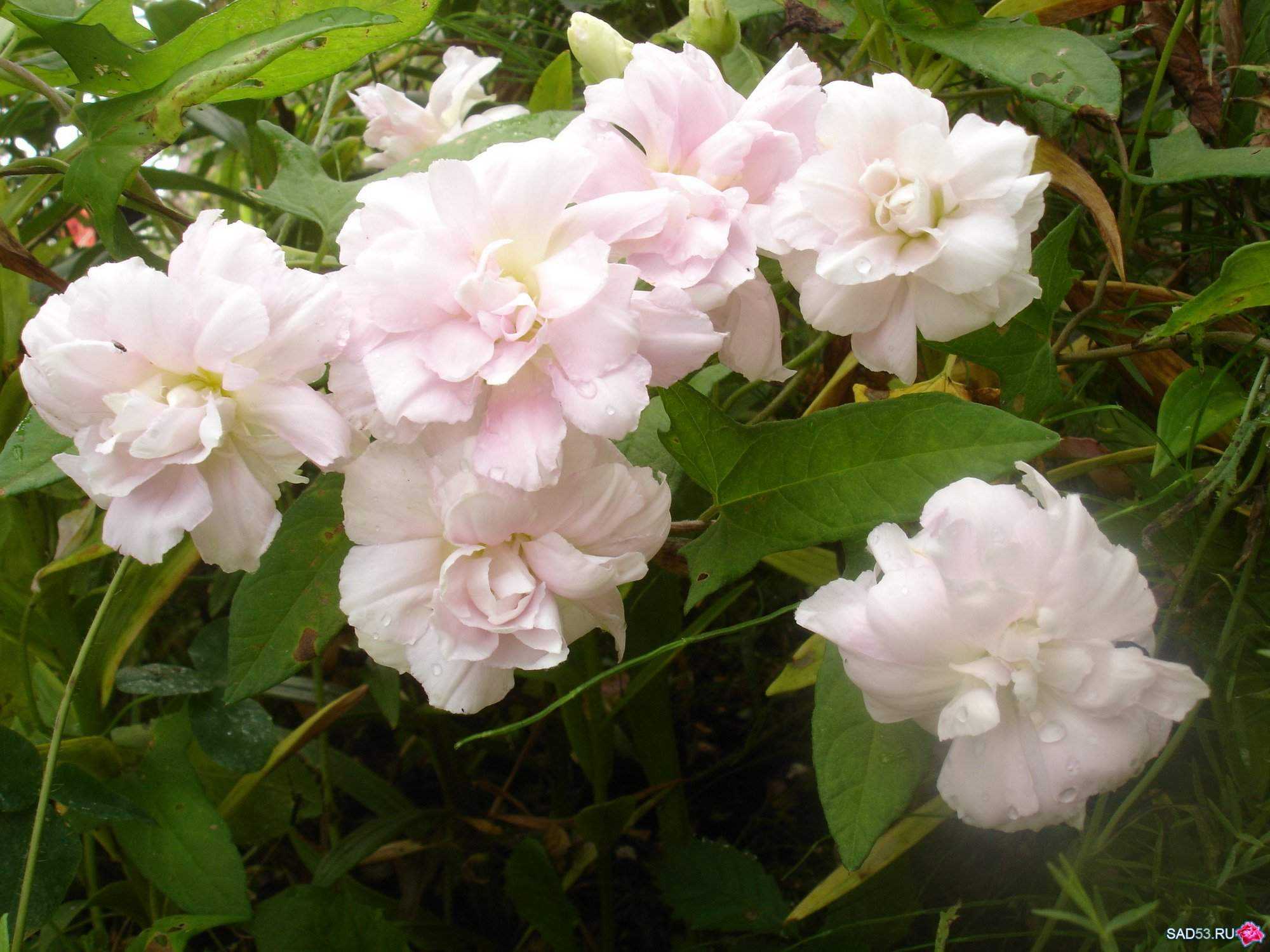 У японской калистегии прочные двухметровые побеги. Цветочки растут на лозе друг за другом, светло-розовые. Лепестки крупные, махровые. Цветут в августе.