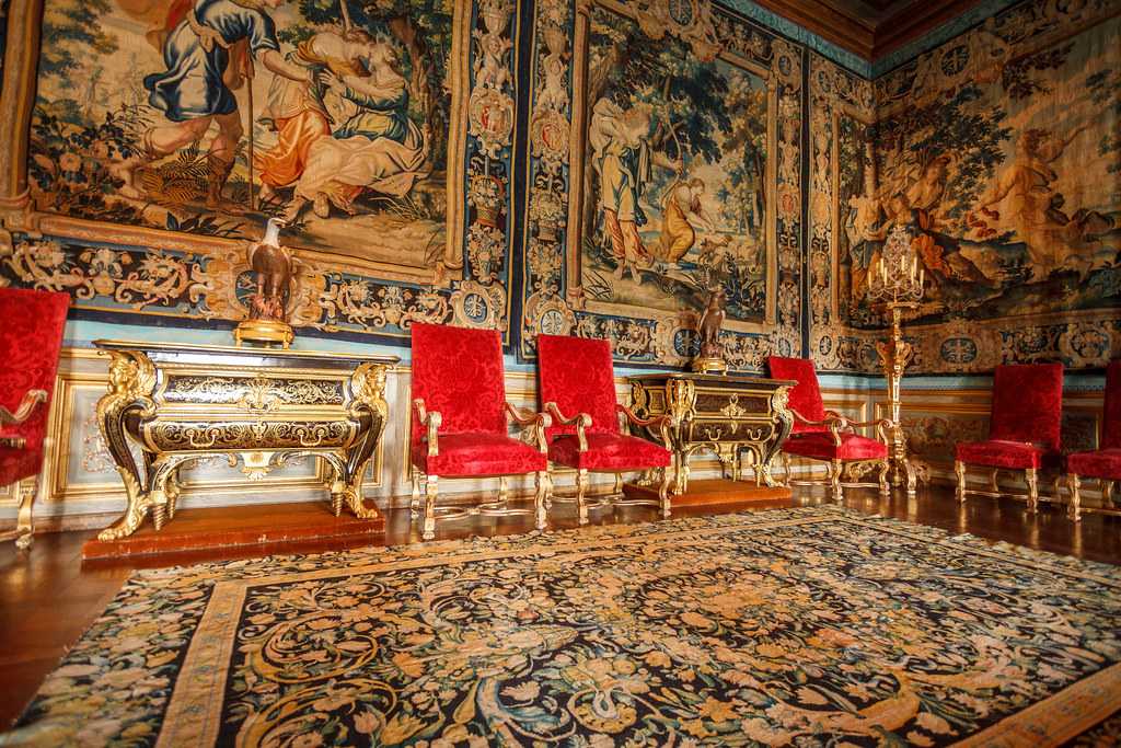 Сразу привлекает внимание огромная кровать, размером почти со спальную комнату. Все поверхности в опочивальне покрыты золотом, подчёркивая высокий статус первой дамы Франции