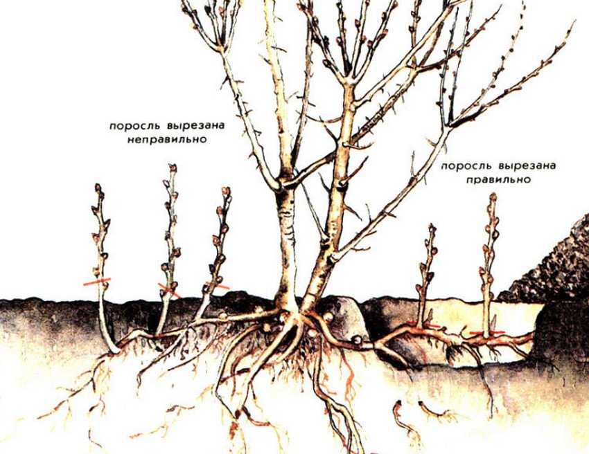 У колючей сливы нужно своевременно удалять корневую поросль, если не планируется использовать её для размножения. Обрезку проводят секатором, срезая побег у самой земли, либо вырубают вместе с частью корня.