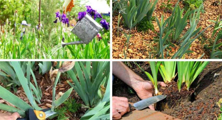 Ирисы требовательны к уходу. В течение вегатационного периода необходимо систематически рыхлить почву (иначе ирисы легко загнивают), удалять сорняки, в засушливое время и особенно в период цветения поливать.
