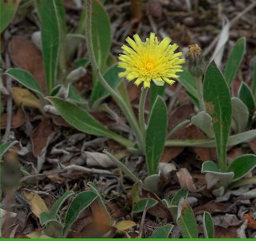 Многочисленные листья расположены в прикорневой розетке, ланцетные, туповатые, к основанию суженные в черешок, по краю цельные, сверху голубовато-зеленые, покрытые рассеянными жесткими длинными волосками, снизу – серовато-войлочные. Корзинки с голым, плоским, ямчатым цветоложем и оберткой из густо опушенных звездчатыми и железистыми волосками листочков. В корзинке около 100 цветков. Все цветки обоеполые, светло-желтые, причем краевые – часто снаружи с красными полосками. В цветках – волосистый хохолок вместо чашечки, язычковый венчик с 5 зубчиками на верхушке, пять тычинок со сросшимися в трубку пыльниками и проходящий через трубку столбик с двураздельным рыльцем.