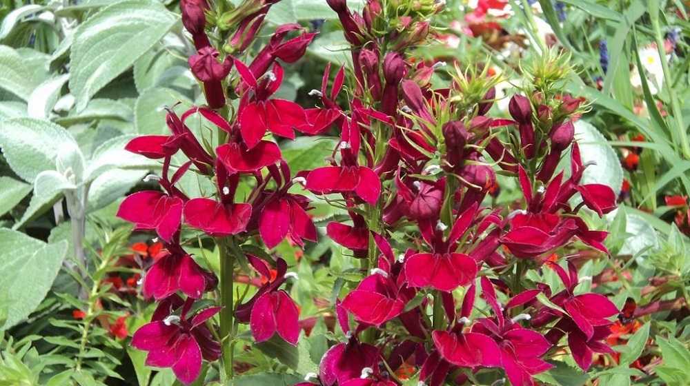 Лобелия пурпурная (Lobelia cardinalis), также известна под названием лобелия кардинальская. Эффектная разновидность растения, выращиваемая на влажных участках или по краям водоемов. Высота побегов – до 80-90 см. Колос соцветия состоит из пурпурных цветов. Лобелия кардиналис выращивается в основном как садовое, реже – как аквариумное растение. В диком виде растет в Северной Америке. Алая лобелия не является полностью морозостойкой, зимой ее следует укрыть или переместить в прохладную и светлую комнату. Цветет с июля до первых заморозков.