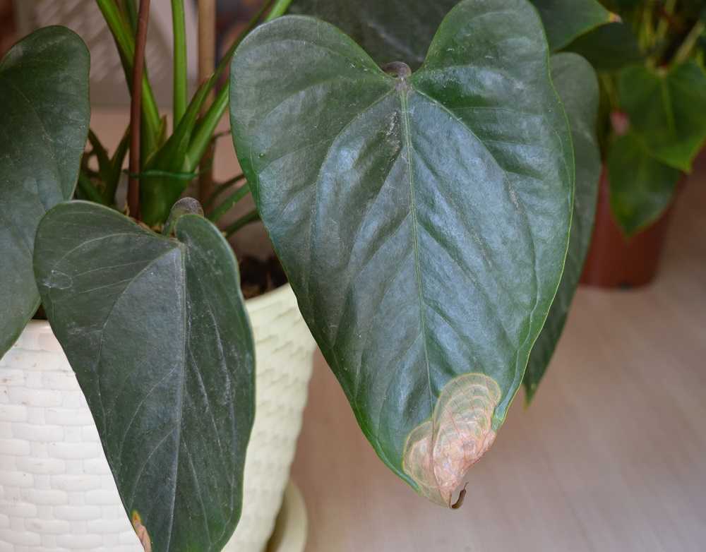• Коричневые кончики листьев антуриума свидетельствуют о слишком сухом воздухе или слишком жесткой воде.