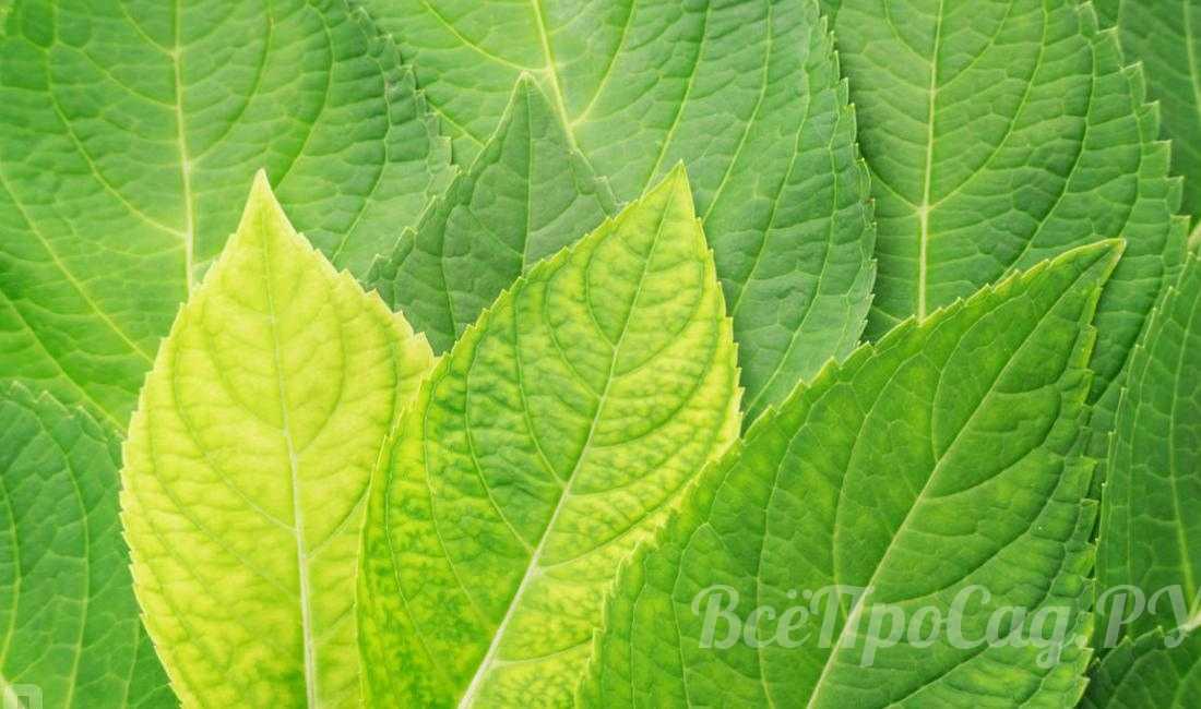 Если на листьях гортензии появляются желтые пятна, а прожилки остаются зелеными, скорее всего это симптомы хлороза. Растение поражается в результате изменения кислотности за счет вымывания поливами из почвы элементов, необходимых для питания гортензии.