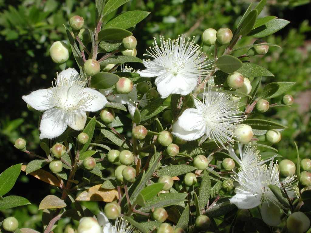 Цветет мирт в июне – августе душистыми белыми либо кремовыми цветочками величиной в сантиметр (со 2-3-го года после посадки). После цветения образуются темно-синие ягоды, иногда часть их имеет белый цвет.