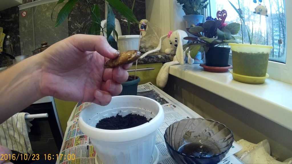 Достают плоское семя, немного выдерживают в воде с добавление стимулятора роста и противогрибкового средства;