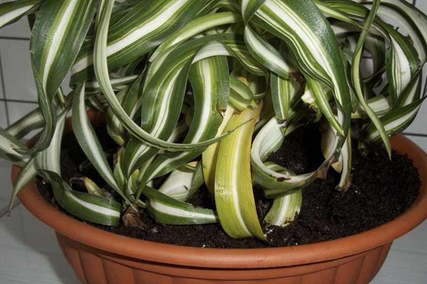У хлорофитума хорошо развитая корневая система, расползаясь в тесном горшке, корни начинают приподнимать стебли над поверхностью почвы. Цветку становится тесно, и он меняет цвет листьев на жёлтый окрас.