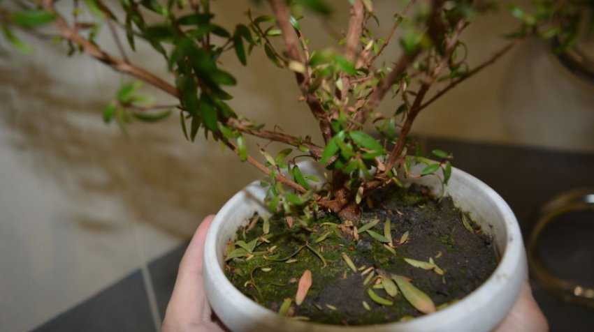 Миртовое дерево обычно пересаживают методом перевалки. Неопытные владельцы комнатных растений снимают земляной ком. Подобные манипуляции могут повредить корневище — от этого нарушается жизнедеятельность цветка. Повреждённые корни не могут полноценно подпитываться водой и подкормками. Вследствие неправильной пересадки растение испытывает стресс и сбрасывает листья.