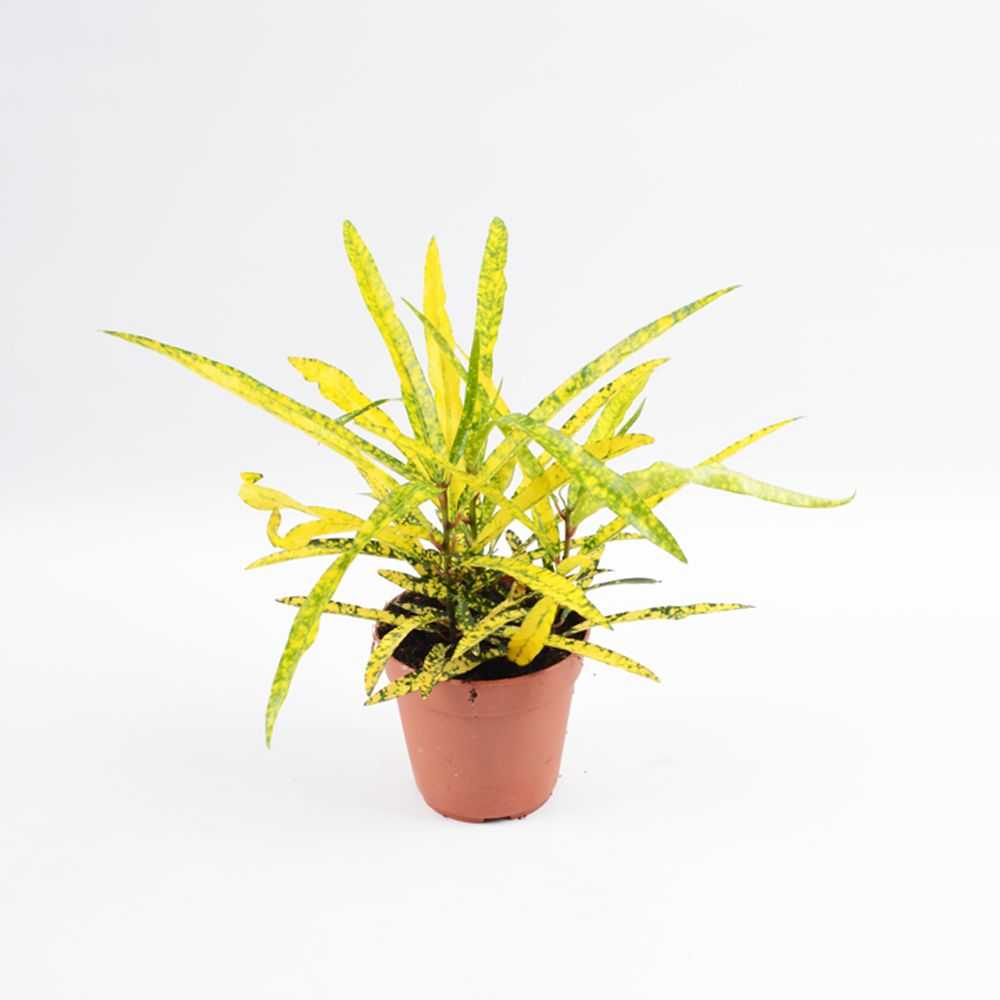 Кодиеум узколистный. Листья 1 см шириной и до 20 см в длину. Основной цвет у них зелёный, а поверхность усыпана жёлтыми пятнами и полосами.