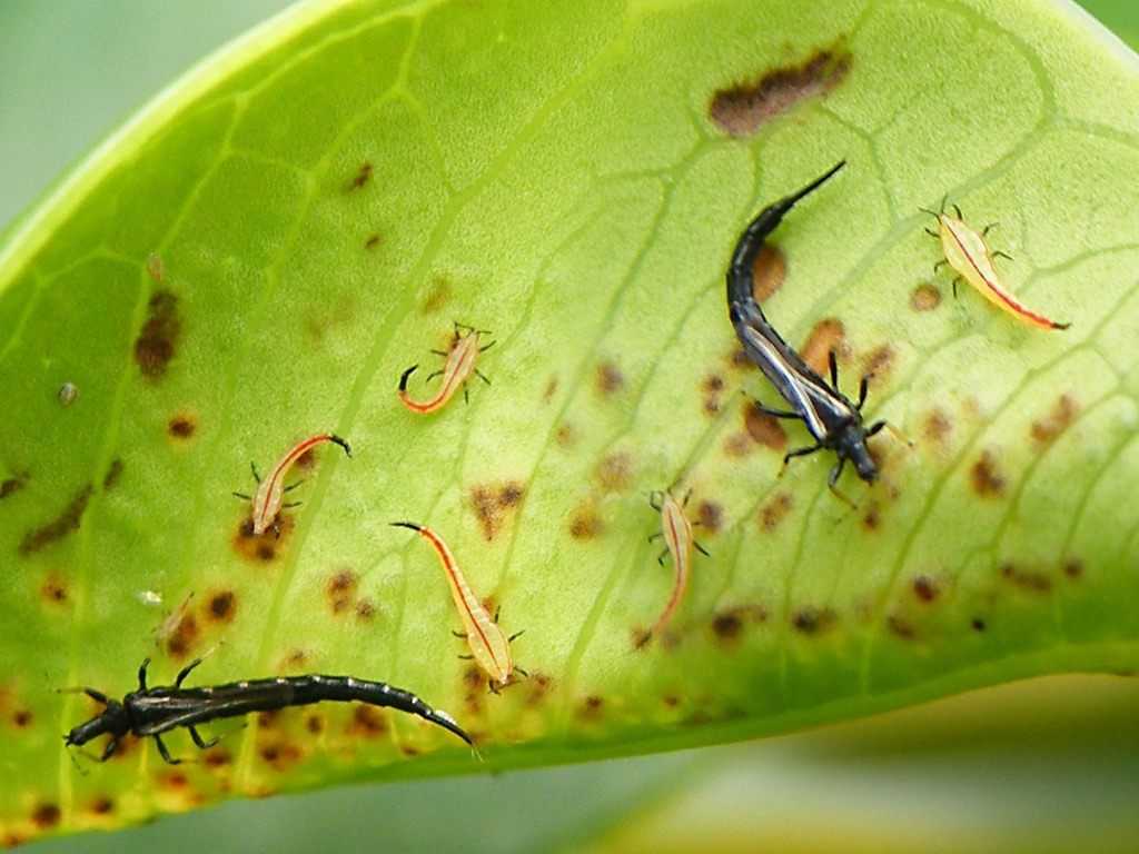 Трипсы — это мелкие крылатые насекомые, которые поселяются на обратных сторонах листьев. Питаются соком растения. Поврежденные листья желтеют и опадают. Лепестки цветков сохнут по краям.