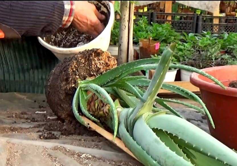 если экземпляр пересаживают целиком, нужно вырезать все поврежденные корни и срезать треть здоровых. В свежем грунте алоэ отрастит новую сильную корневую систему.
