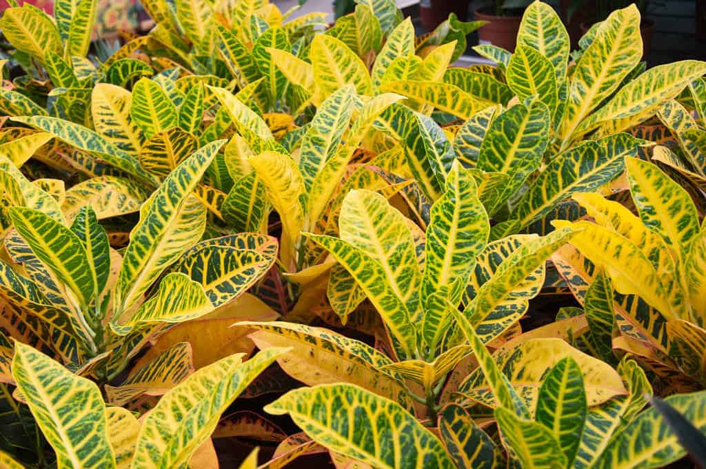 Кротон или кодиеум пёстрый – это небольшое деревце с причудливыми разноцветными листьями, за которые его и ценят цветоводы. Окрас растения зелёно-жёлтый, красный и розовый. При правильном уходе листья плотные и крепкие, зелень густая. Добиться такого презентабельного вида непросто, ведь выращивание кротона — довольно хлопотное дело. Круглый год растению нужно много света, иначе листва потускнеет и потеряет нарядный окрас. Летом достаточно солнца, а зимой придётся обзавестись люминесцентной лампой. Только таким образом можно обеспечить растению свет 12 часов в сутки.