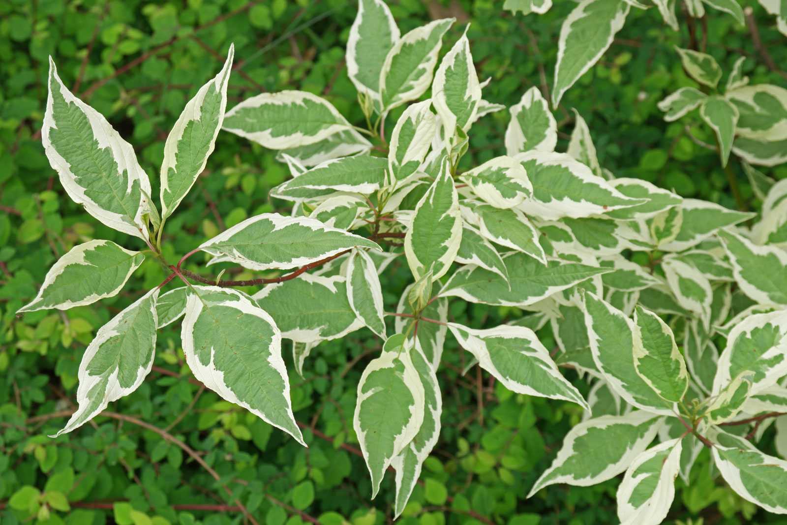 Ветки пестролистного дерена с зелено-белыми листьямиИсточник jubkiplus.ru/
