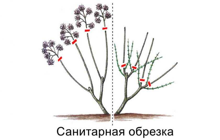 - Удалять засохшие или сломанные ветки. Также в процессе санитарной обрезки срезают повреждённые соцветия и листья, чтобы растение быстрее регенерировало.
