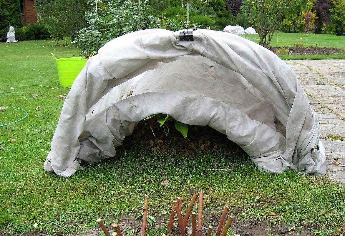 - Накройте куст двумя слоями агроволокна и закрепите. Если он большой, можно сделать вокруг каркас из деревянных кольев или металлических дуг и закрепить укрывной материал на нем.