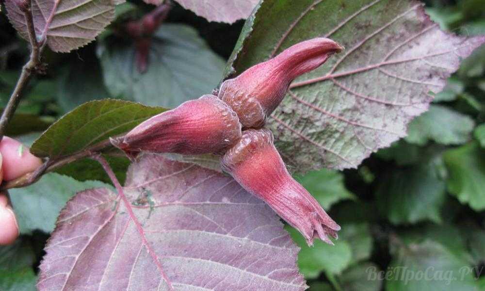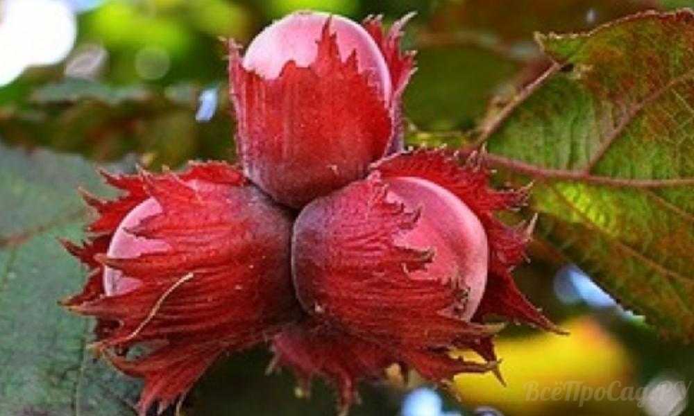 Этот вид является уже высокорослым, ведь высота лещины краснолистной составляет не меньше 5 метров. Диапазон ее распространения в дикой природе — хорошо увлажненные земли, чаще всего, в лесах. Крона шаровидная, кора серого цвета. Листья круглые, среднего размера, их цвет на протяжении всего года меняется на разные оттенки бордового и коричневого. Для получения урожая высаживать нужно на освещенных местах. Размножать этот вид лещины можно разными способами.