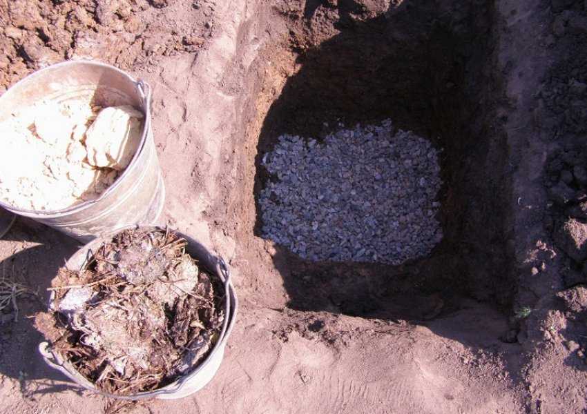 Перед тем, как поместить в яму саженец, на дно кладут слой дренажа примерно 5 см. Почва для засыпания углубления — равные части дерновой земли, песка и торфа.
