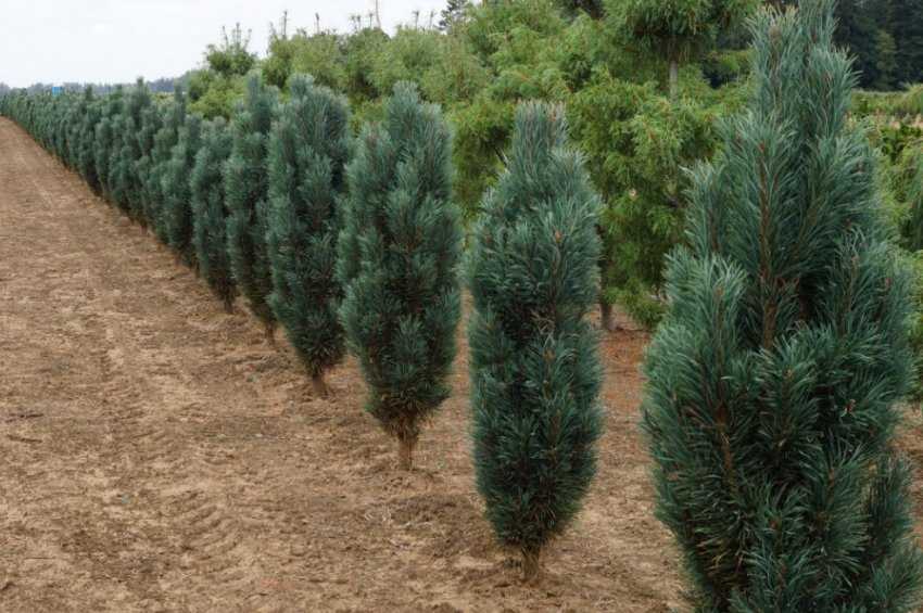 - Фастигиата. Деревья этого сорта отличаются компактной колоновидной формой и густой хвоей красивого серебристо-зеленоватого цвета. Молодые растения имеют вид кустарников, но растут они быстро, в течение календарного года прибавляя 0,2 метра. Выращивать Фастигиату несложно: сосны демонстрируют устойчивость к заморозкам и суровым холодам, к ветру, недостатку влаги.