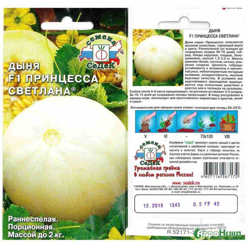 Это раносозревающий гибридный сорт, который стойко переносит температурные перепады и обладает устойчивостью к опасным вредителям. Если выращивать Принцессу Светлану в благоприятных условиях, урожай поспеет в течение 60-65 дней. Зрелые дыни покрыты кремовой кожицей с желтоватым оттенком. Их средняя масса составляет 2-3 кг.