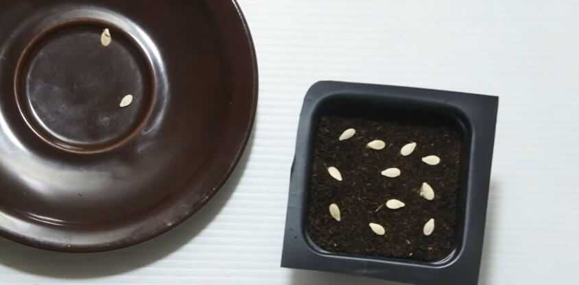 За день до посадки в горшок семена замачивают в теплой воде или в растворе препарата для стимуляции проращивания (Эпин Экстра, Экосил, Циркон). Набухшие семена углубляют в плодородную легкую почву на расстоянии 10 – 12 сантиметров друг от друга. Землю поливают, горшок ставят в теплое место.