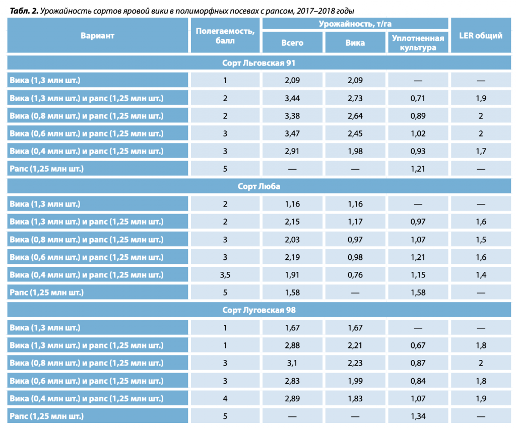 Во время исследований также было установлено, что сорта вики яровой укосного использования Льговская 91 и Красноуфимская 49 показывали положительную аллелопатию при совместном выращивании с рапсом. В частности, отмечалось существенное возрастание урожайности бобовой культуры при снижении продуктивности капустной по сравнению со значениями в одновидовых посевах: объемы сбора вики повысились с 2,09 до 2,45–2,73 т/га, или на 17,2–30,6%. При этом производительность гектара пашни на бинарных вариантах увеличилась в 1,9–2 раза.